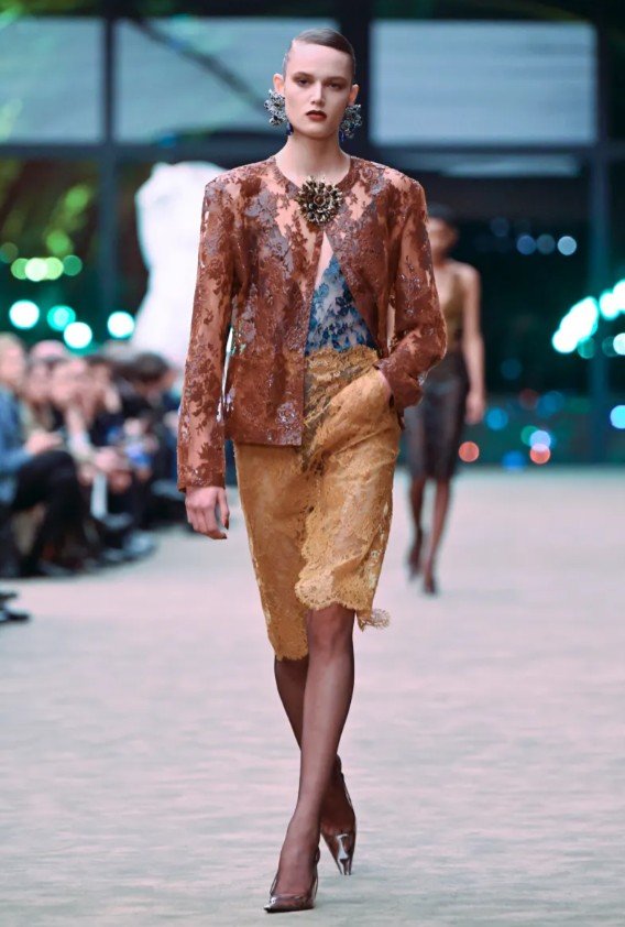 Uno de los elementos más destacados del desfile fue el uso del encaje, presente en vestidos, blusas y faldas que jugaron con transparencias y capas. Este tejido introdujo una dimensión más delicada dentro de una colección que históricamente se ha caracterizado por prendas estructuradas, generando un contraste entre fragilidad y fuerza que definió gran parte del lenguaje visual presentado en la pasarela.