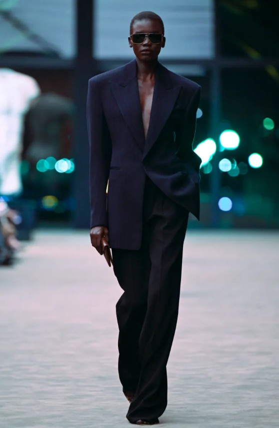 Entre las propuestas más celebradas destacó el regreso del traje sastre, reinterpretado con chaquetas entalladas y pantalones rectos en conjuntos monocromáticos. Más que una simple referencia al pasado, la prenda reafirma el ADN de la maison y su vínculo con una elegancia poderosa y sensual.